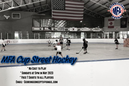For 3 consecutive Sundays in May at 5pm (May 7, May 14, & May 21), the Merrill Fay Arena will host Drop in, Free of charge Street Hockey for players aged 6-16.All players must bring their own Stick, Helmet (with facemask), and gloves to participate. Sessions will be roughly 1 hour long with a brief skill clinic prior to a scrimmage each night. All players participating will receive a Free T Shirt and learn the skills that can help them be introduced to the game of hockey, or develop their skills in a fun setting.